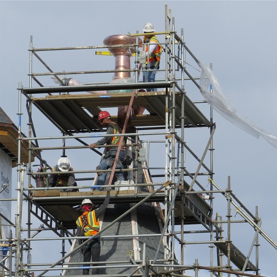 | The southeast tower has slate all the way to the top, with the base of its finial in place. |